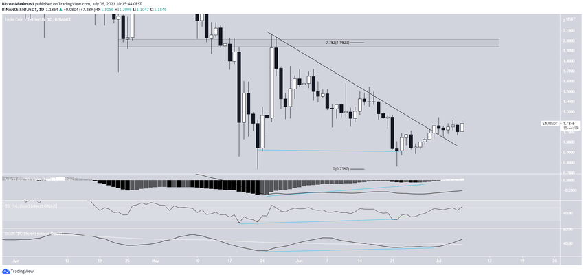 Как и в случае с XRP, ENJ с 26 мая двигался вдоль линии нисходящего сопротивления. 30 июня рынок совершил успешный прорыв этой отметки, а вскоре превратил ее в поддержку.