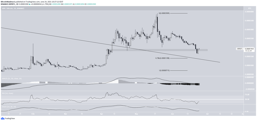 В противном случае курс XRP может упасть к 1 400 сатоши (уровень Фибо 0.786 коррекции) и проверить на прочность линию бывшего долгосрочного нисходящего сопротивления.
