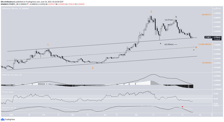 Не исключено, что текущая нисходящая динамика является частью подволны С (черный цвет) отката четвертой волны. В этом случае ETH достигнет минимума на ₿0.05, прежде чем начать рост. Целью является уровень Фибо 0.618 коррекции, что даст коэффициент соотношения подволн A:C как 1:1.