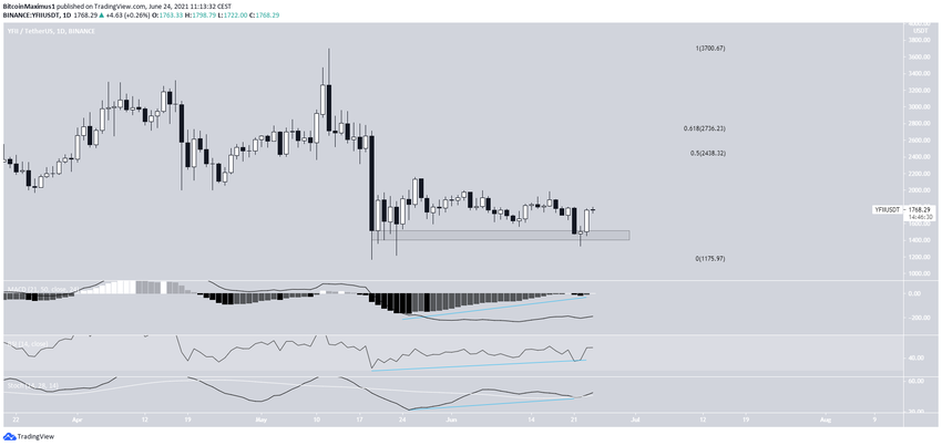 Курс YFII сформировал 19 мая минимум на $1169 и отскочил от него. Впрочем, рынку не удалось развить рост, и 23 июня коин откатился обратно к горизонтальной поддержке на $1400.