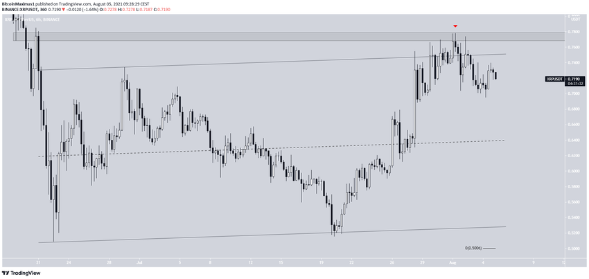 Коин проекта Ripple XRP с 22 июня рос внутри восходящего параллельного канала. Цене удалось достичь максимума на $0.77, но затем рынок получил отпор области горизонтального сопротивления $0.78 и линии сопротивления канала (красный значок).