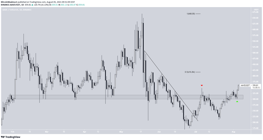 Курс AAVE совершил 30 июня бычий пробой линии нисходящего сопротивления и с тех пор рос.