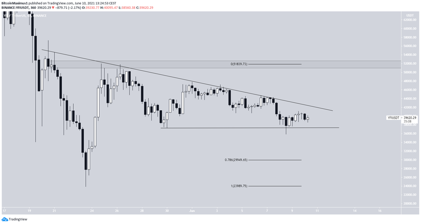 YFI оттолкнулся от поддержки 23 мая и с тех пор растет. На следующий день после отскока цена достигла $51 963. Однако нисходящая линия сопротивления от 19 мая остановила рост.