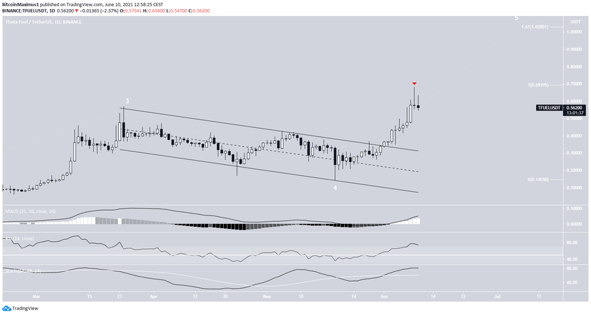 TFUEL вырвался за пределы нисходящего параллельного канала 1 июня. Токен продолжил расти и 9 июня достиг исторического максимума на уровне $0,679. В тот же день на графиках появилась «падающая звезда».