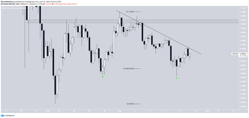 XRP отскочил от 0,618 коррекции Фибоначчи 8 июня. Цена сформировала двойную вершину относительно 29 мая.