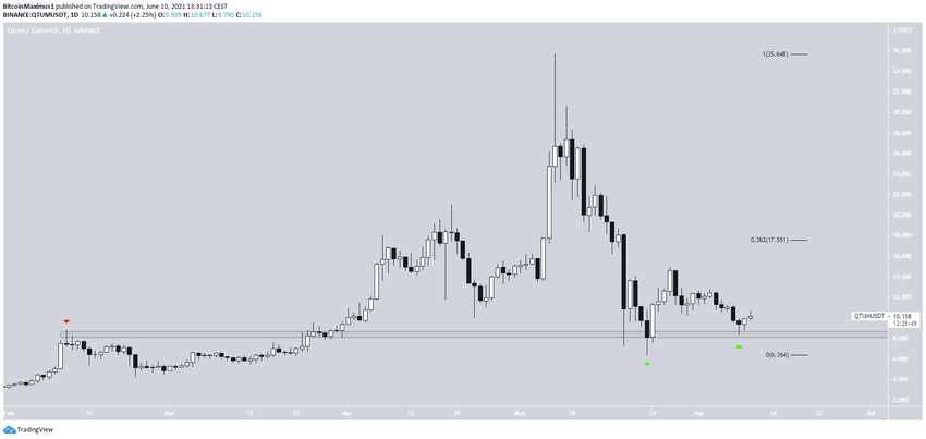 Цена на QTUM достигла минимума 23 мая, затем началась коррекция. Сейчас цена пытается подтвердить поддержку $8,40 и сформировать повышающийся минимум. Если ей это удастся, возможен рост к сопротивлению $17,55. Эта цель совпадает с 0,382 коррекции Фибоначчи.