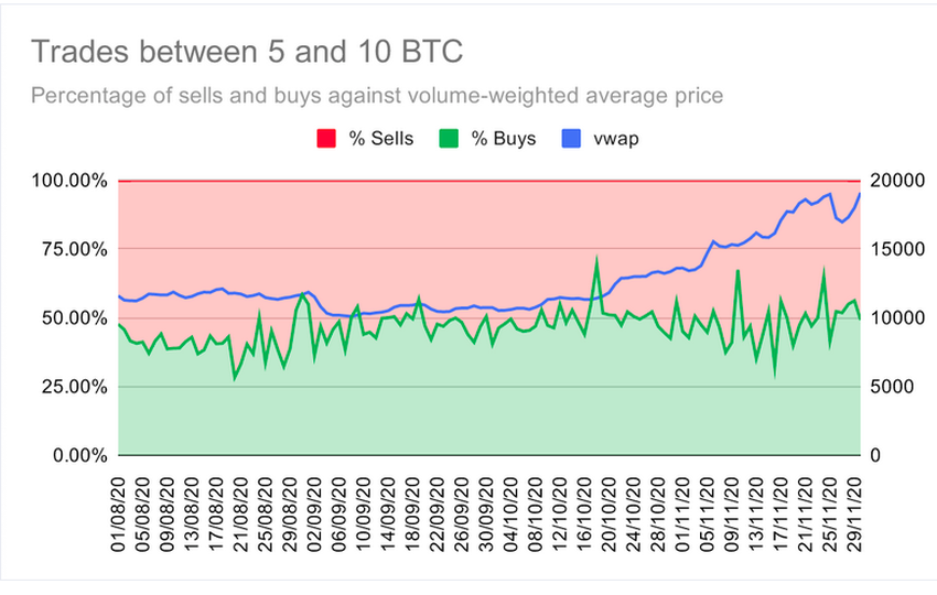 В опубликованном исследовании аналитики биржи OKEx решили изучить такие характеристики, как размеры торговых позиций и направление ордеров (покупка или продажа). С помощью этих параметров они попытались сравнить, как разные категории участников рынка отреагировали на бычий забег биткоина в августе-ноябре 2020 года.