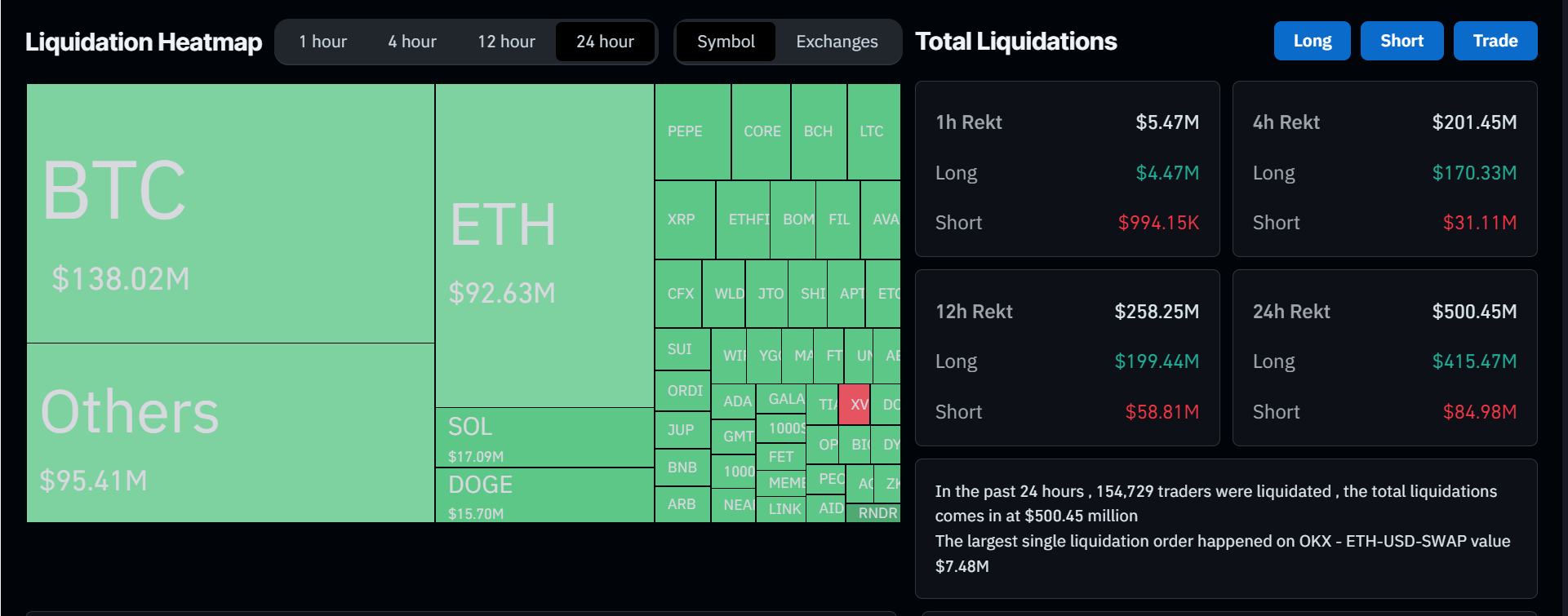 Более 90% ликвидаций были распределены между OKX, Bybit, Binance и Huobi. Самый крупный ордер выполнила OKX — биржа закрыла позицию ETHUSD на $7,48 млн.