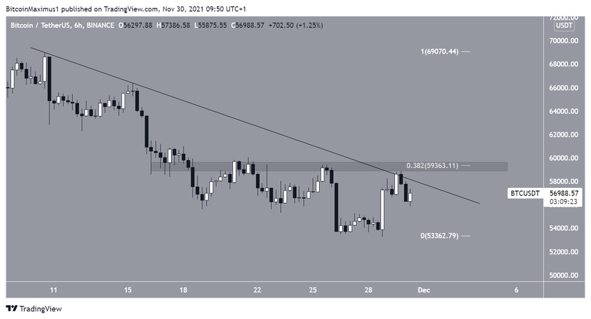 Биткоин совершил 28 ноября отскок от области $53 350 (горизонтальная область и уровень Фибо 0.5 коррекции, выделено на графике белым цветом). Схождение двух поддержек усиливает значимость этой зоны, а отскок BTC от нее подтвердил, что она играет роль поддержки.