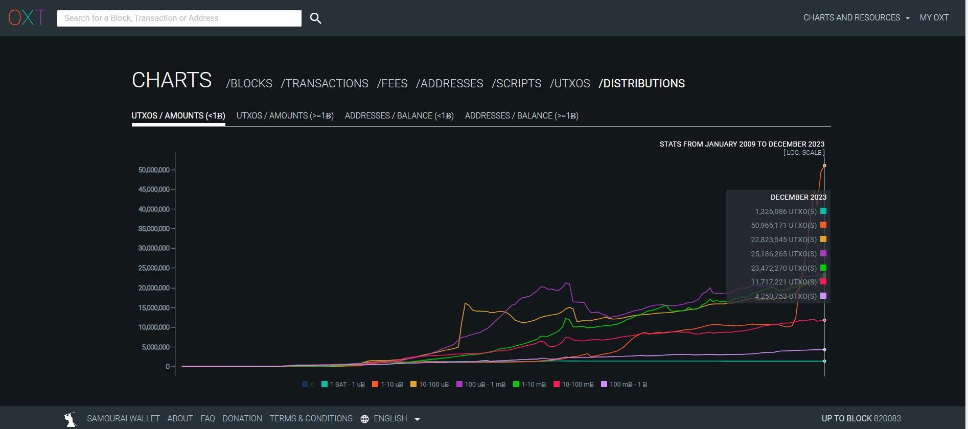 По словам пользователя, только 40 млн UTXO из тех, что добавились за семь последних месяцев, стоят от 100 до 1000 сатоши. Большинство из них — это «надписи» BRC-20 MINT, стоимость которых составляет менее 546 сатоши.