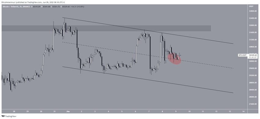 На 2-часовом таймфрейме можно увидеть, что BTC снижается внутри краткосрочного нисходящего параллельного канала. На данный момент рынок пытается удержаться над срединной линией этого канала (красный значок).