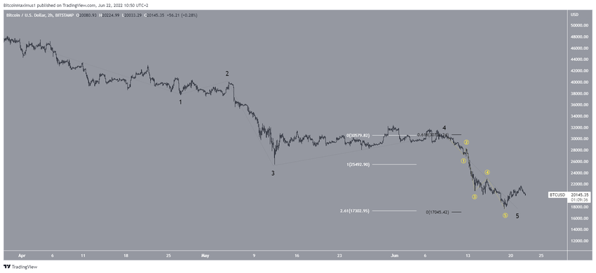 Что касается наиболее вероятного краткосрочного волнового прогноза, то BTC предположительно завершил формирование пятиволновой медвежьей структуры, начатой в апреле (черный цвет). Результаты подволнового анализа представлены на графике желтым цветом.