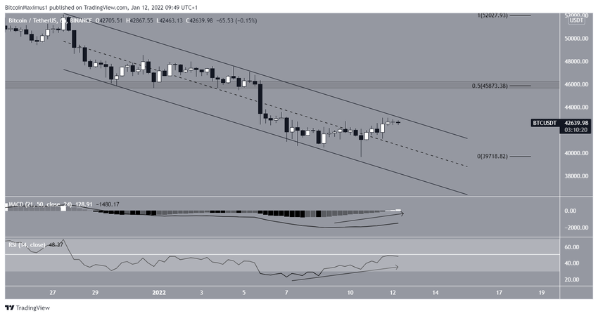 Биткоин с 27 декабря снижался внутри нисходящего параллельного канала. В итоге 10 января цена сформировала локальный минимум на $39 650. Отсюда BTC отскочил и попытался укрепиться.