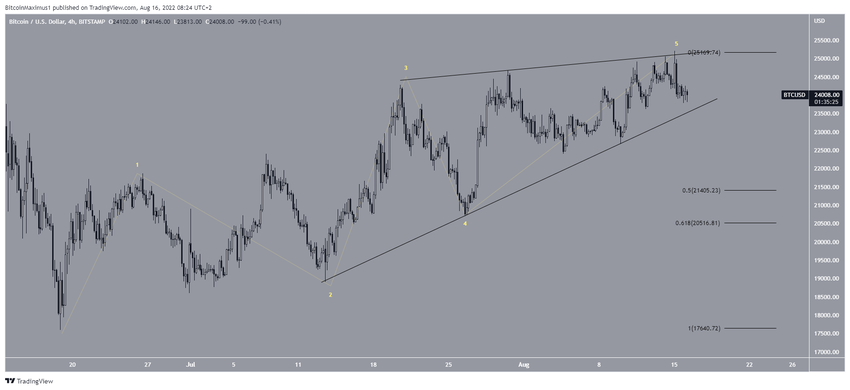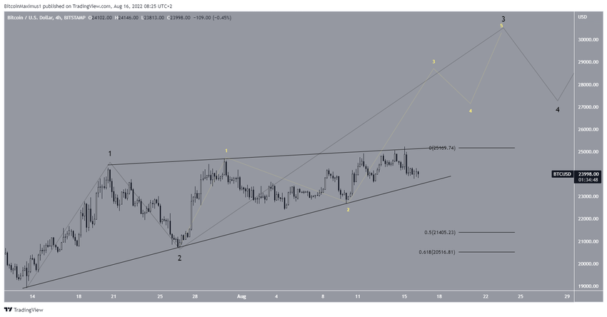 Чтобы данный сценарий оставался жизнеспособным, BTC должен удержаться выше уклона изначальных волн 1-2 и совершить бычий прорыв линии восходящего сопротивления (черный цвет).