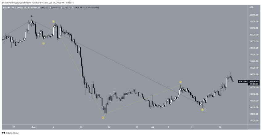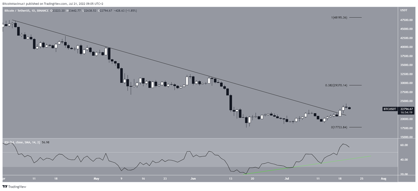 20 июля биткоин совершил бычий прорыв из краткосрочного восходящего параллельного канала, а также пробился выше области горизонтального сопротивления $22 700. Впрочем, за этим ходом последовало снижение, вернувшее цену обратно внутрь канала и области сопротивления.