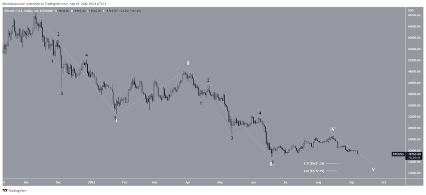 Результаты волнового анализа предполагают, что биткоин находится сейчас в пятой, заключительной, волне медвежьей структуры (белый цвет), берущей свое начало от исторического максимума, достигнутого в ноябре.