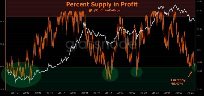 Несмотря на медвежью динамику цены и технических индикаторов, большинство ончейн-индикаторов продолжают упрямо сулить валюте близкое дно. Так, недавно аналитик @OnChainCollege разместил в Twitter график одного из таких индикаторов. Он обратил внимание, что показатель доли биткоин-адресов с монетами, находящимися в состоянии прибыли (percent supply in profit), опустился ниже отметки 48%.