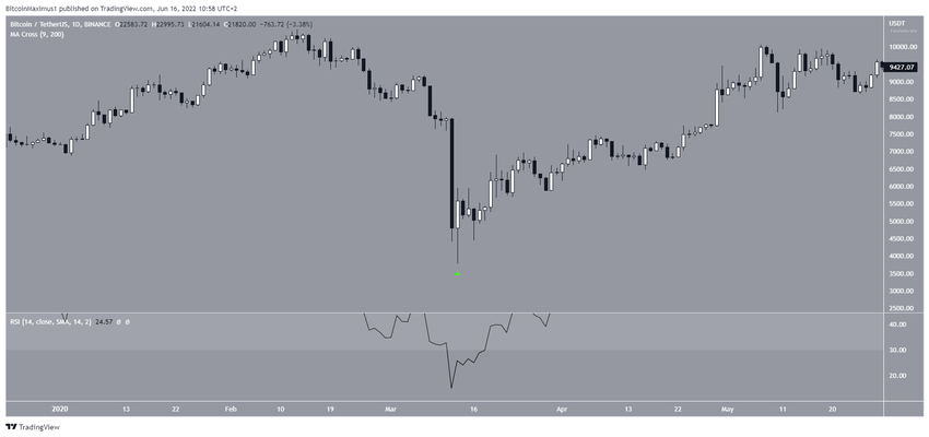 Свеча имеет сходство со свечой от 13 марта 2020 года. Тогда аналогичная бычья свеча появилась на графике после резкого падения цены и на фоне значения RSI, равного 15, причем тогда тоже не наблюдалось никаких сигналов бычьей дивергенции.