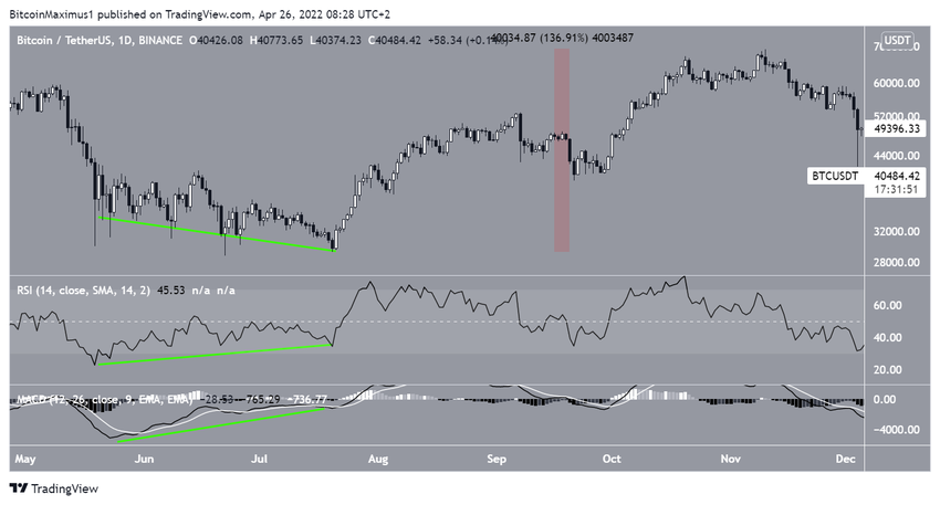В последний раз подобные сигналы бычьей дивергенции по RSI и MACD появлялись в июне/июле 2021 года, и после этого BTC вырос более чем на 130%.