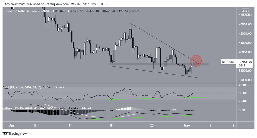 На 6-часовом графике биткоин с 17 апреля торгуется внутри паттерна «нисходящий клин». Это бычья модель, которая указывает на то, что наиболее вероятным сценарием для рынка является бычий прорыв.