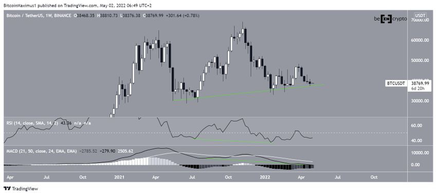 Кроме того, биткоин, вероятно, держится над линией восходящей поддержки, берущей свое начало от минимумов апреля 2021 года (зеленая линия).
