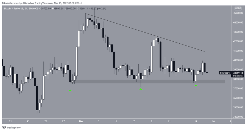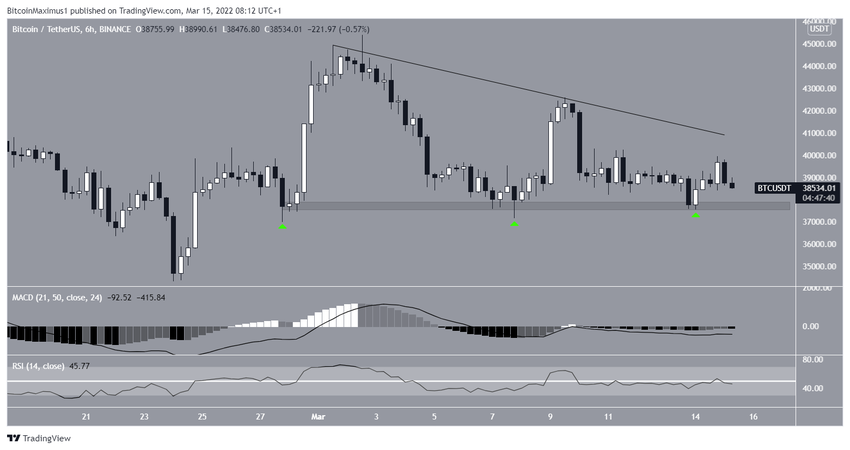 На 6-часовом графике BTC с 28 февраля торгуется над областью горизонтальной поддержки $37 700. Рынок уже много раз тестировал эту область (зеленые значки). В последний раз это произошло 14 марта.