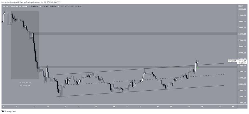 6-часовой таймфрейм также подтверждает настрой дневного графика. Здесь BTC совершил бычий прорыв из восходящего параллельного канала и впоследствии проверил его на прочность уже в качестве поддержки (зеленый значок). В момент этого прорыва курс BTC также пробился выше области горизонтального сопротивления $22 800.