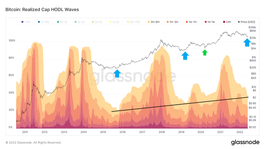 Перевернутый график этой ончейн-метрики проливает дополнительный свет на ситуацию. Он учитывает лишь краткосрочные объемы (менее 6-ти месяцев). Здесь мы можем увидеть систематическое сокращение объема коинов у краткосрочных ходлеров в периоды долгосрочного медвежьего рынка.