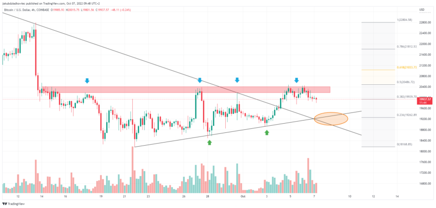Если цена снова решит протестировать эту линию восходящей поддержки, нельзя исключать краткосрочной просадки биткоина в район $19 200 (оранжевый овал).