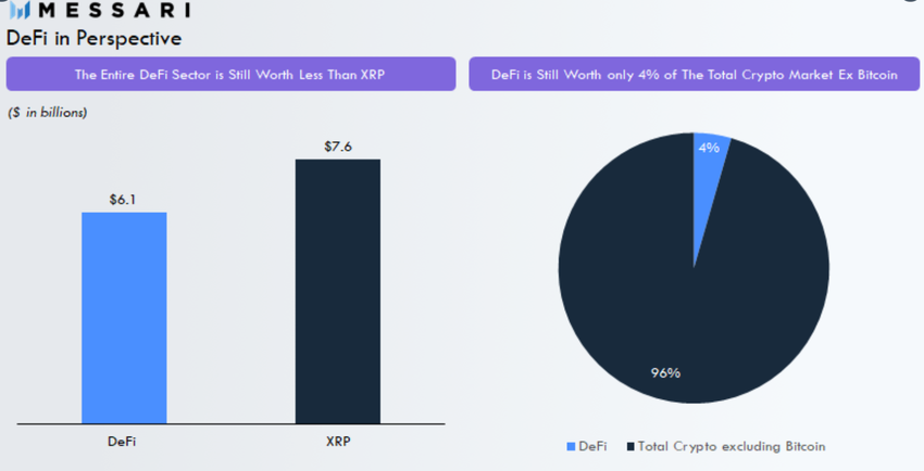 Из-за нынешнего хайпа может даже создаться впечатление, что рынок DeFi разросся до размера рынка биткоина. Однако это далеко не так. Согласно данным Messari, общий размер сектора DeFi составляет $6 млрд. Этот показатель не дотягивает даже до капитализации XRP, которая в рейтинге криптовалют является лишь 4-й. Кроме того, доля DeFi на криптовалютном рынке без учета биткоина составляет всего 4%.