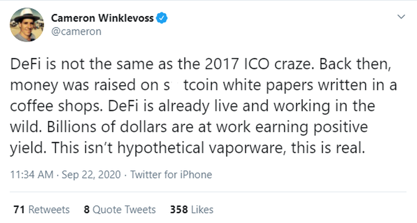 Между тем сооснователь криптобиржи Gemini Кэмерон Уинклвосс настроен еще более позитивно. В своем твите он предпочел сделать акцент не на сходствах, а на различиях между DeFi и ICO.