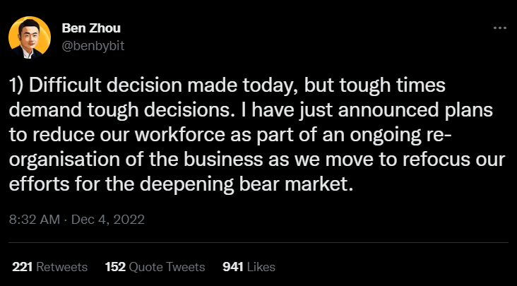 Ранее свыше 1000 сотрудников уволила криптобиржа Kraken, а общее число сокращений на крипторынке уже перевалило за 5000 человек. На фоне новостей основатель Binance Чанпен Чжао предупредил в твиттере, что пользователям стоит «избегать платформ, которые проводят увольнения».