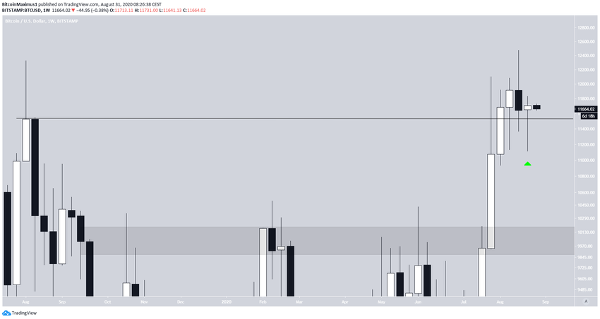 Ключевое сопротивление проходит на отметке $11 750, где находится вершина свечной модели бычьего поглощения от 25 августа, тогда как ключевая поддержка находится на уровне $11 250.