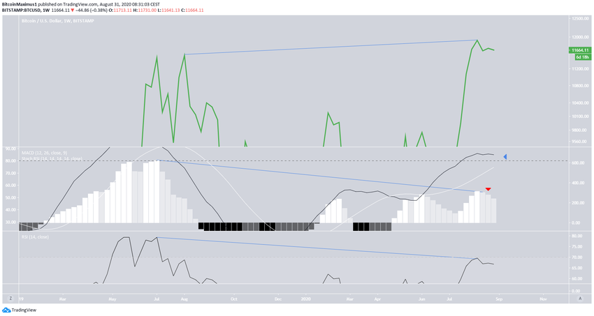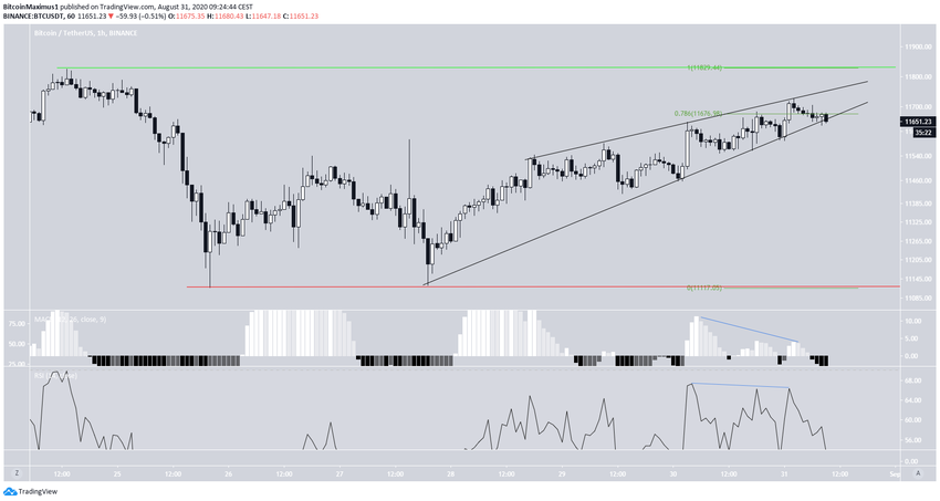 На часовом графике видно, что биткоин торгуется внутри восходящего клина с 27 августа. Это медвежий паттерн, который предполагает снижение котировок. Более того, эта модель сочетается с существенными сигналами медвежьей дивергенции со стороны RSI и MACD.