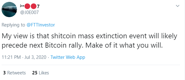 Крипто-миллионер, который выступает в социальной сети Twitter под ником @Joe007, написал, что «массовое вымирание shitcoin, вероятно, будет предшествовать следующему ралли биткоинов. Делай из этого что хочешь».
