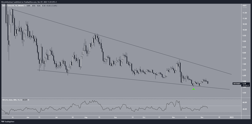 Курс коина проекта Polkadot (DOT) отметил в ноябре 2021 года исторический максимум на $55.09 и с тех пор снижался, двигаясь вдоль линии нисходящего сопротивления. В итоге в прошлом месяце цена достигла минимума на $5. Отсюда рынок совершил отскок и проверил область $5.40 на прочность в качестве поддержки, однако цене так и не удалось запустить после этого какой-либо значимый рост.