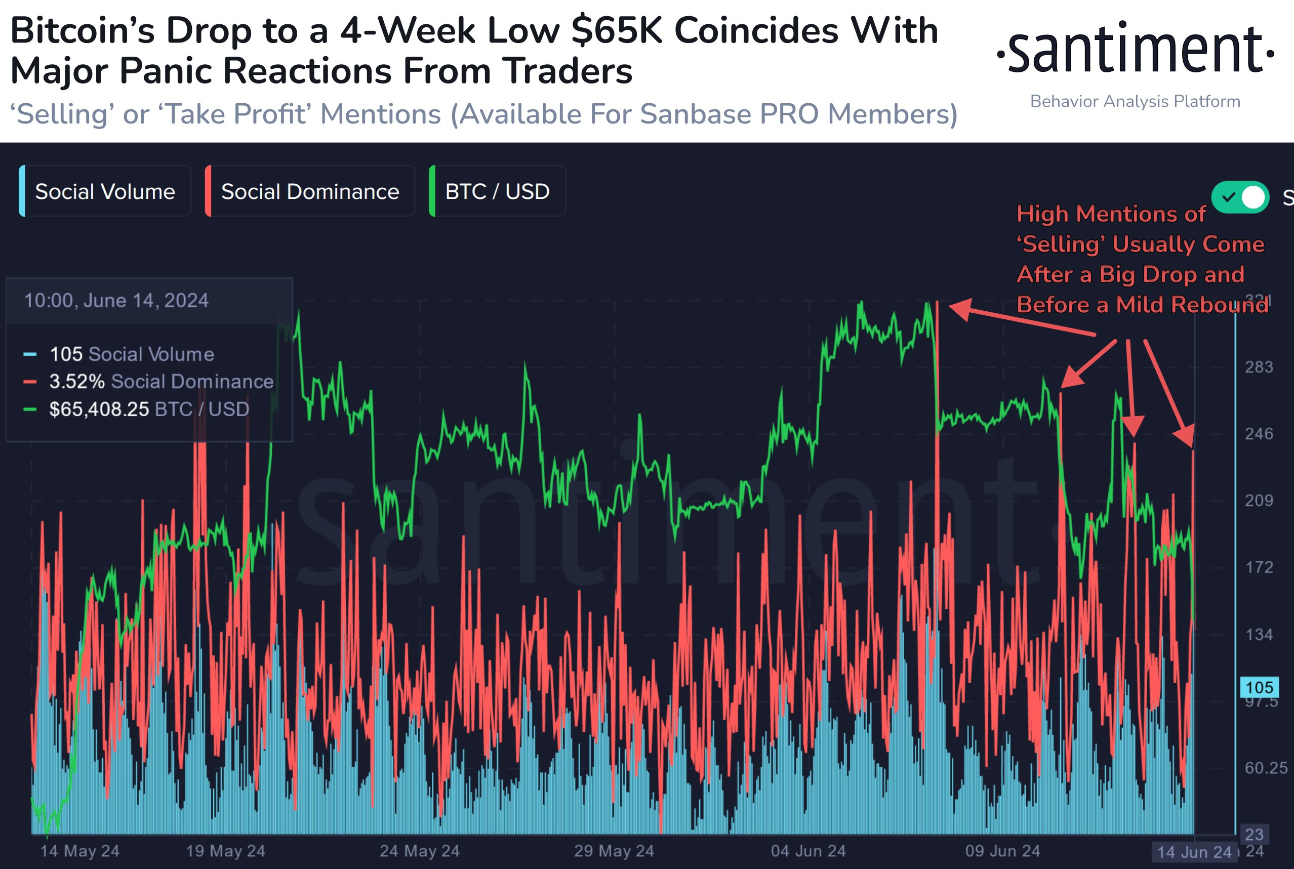 Аналитики Santiment отметили рост панически настроений среди инвесторов, поскольку цена BTC упала до $65 000. Продолжение продаж может привести к временному отскоку и возможности для покупки.