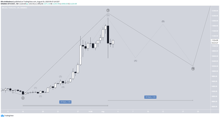 Достигнув максимума на отметке $12 134, биткоин пробил недавнюю область поддержки, достигнув уровня 0,5% отката Фибоначчи относительно бычьего хода. После обвала криптовалюта сократила потери, вернувшись выше зоны поддержки $10 850 и уровня $11 000.