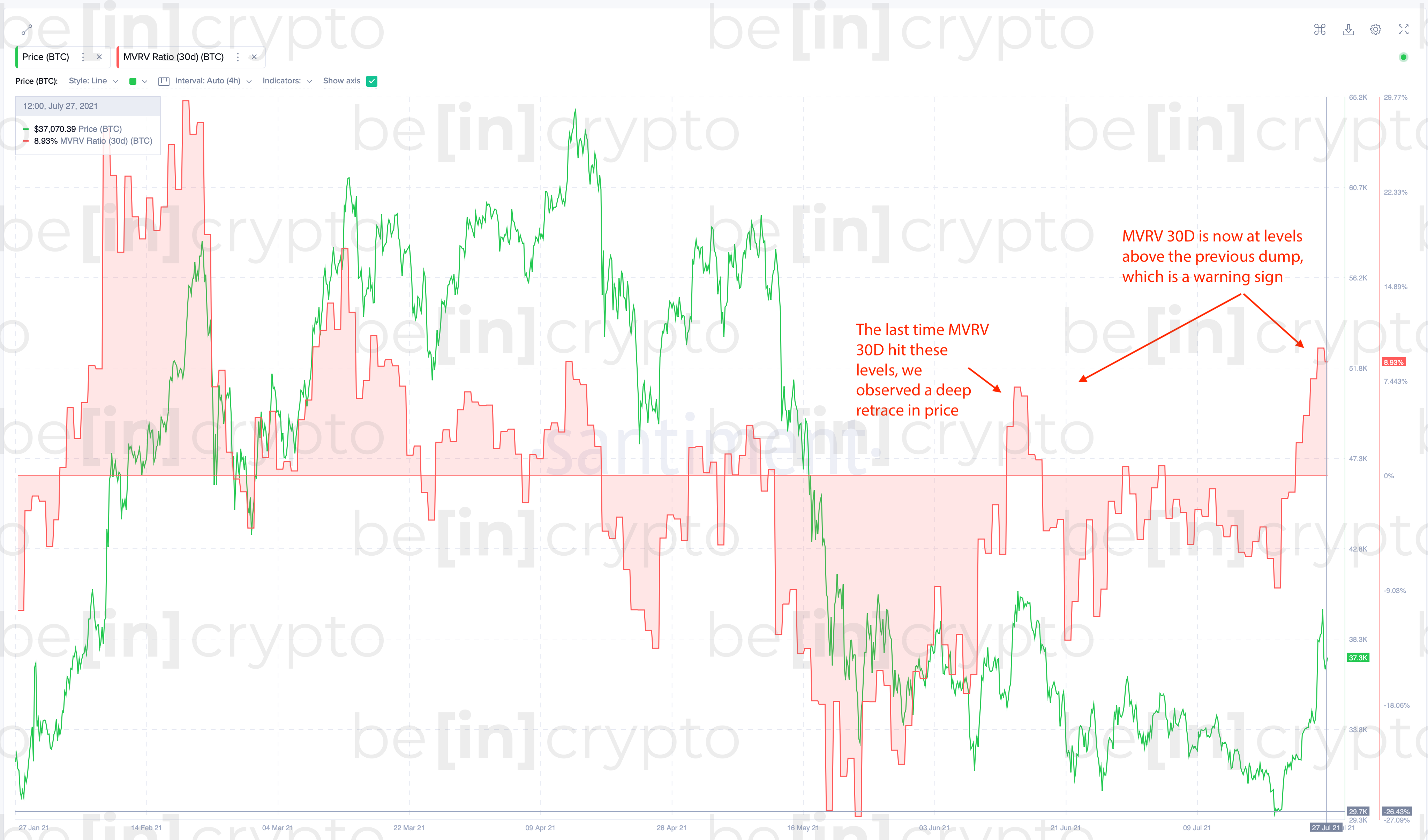Впрочем, риски резкого разворота цены биткоина все еще реальны. Например, метрика рыночной стоимости биткоина к фактической (MVRV) в месячном интервале сигнализирует о риске перекупа ведущей криптовалюты.