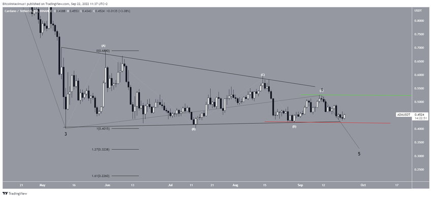 Результаты волнового анализа демонстрируют, что Cardano, вероятно, торгуется внутри симметричного треугольника, который может представлять собой волну 4 (черный цвет) пятиволновой медвежьей структуры. Результаты подволнового анализа представлены белым цветом.