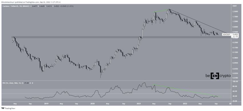 Курс ADA с сентября 2021 года снижался вдоль линии долгосрочного нисходящего сопротивления, откатываясь от обновленного исторического максимума $3.10. В итоге в мае 2022 года цена достигла минимума на $0.40.