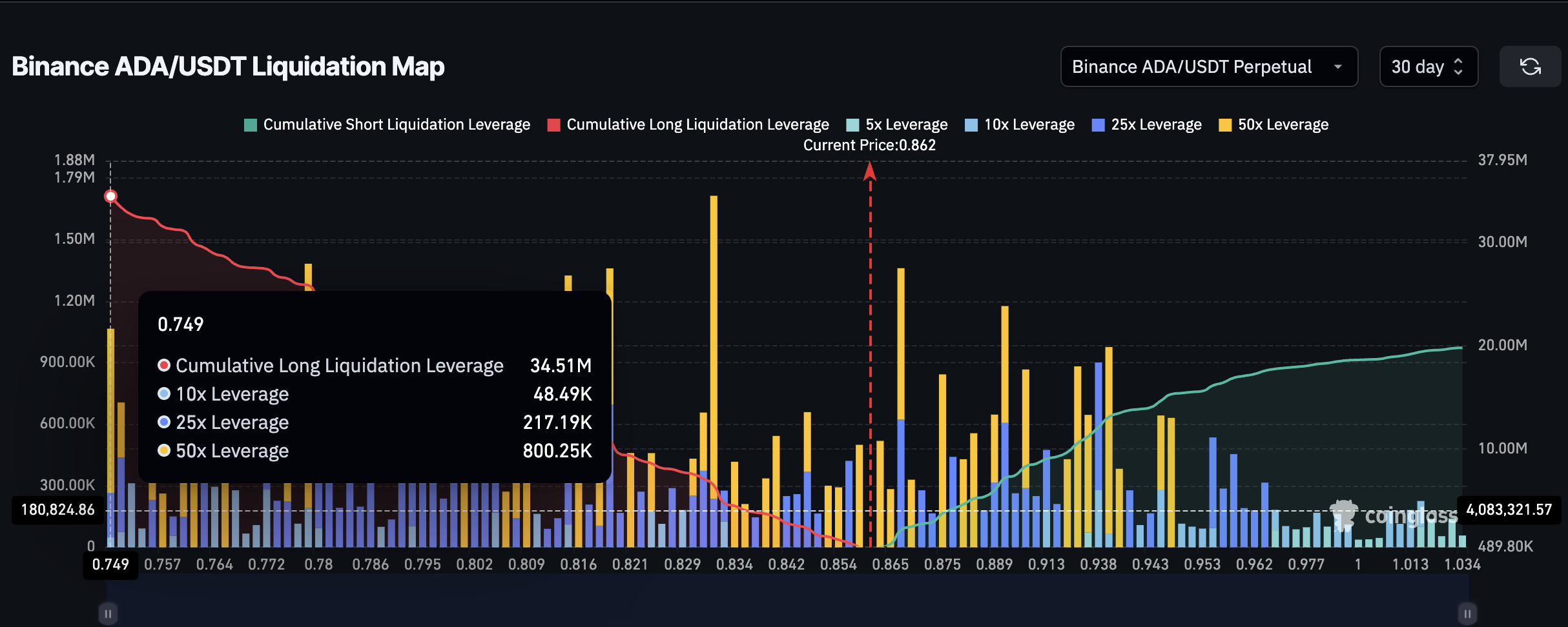 На уровне $0,749 сконцентрированы длинные позиции трейдеров на сумму $34 млн. Эти инвесторы делают ставку на рост ADA, используя заемные средства для увеличения потенциальной прибыли. Но если цена продолжит снижаться и пробьет этот критический уровень, произойдет массовая ликвидация позиций.