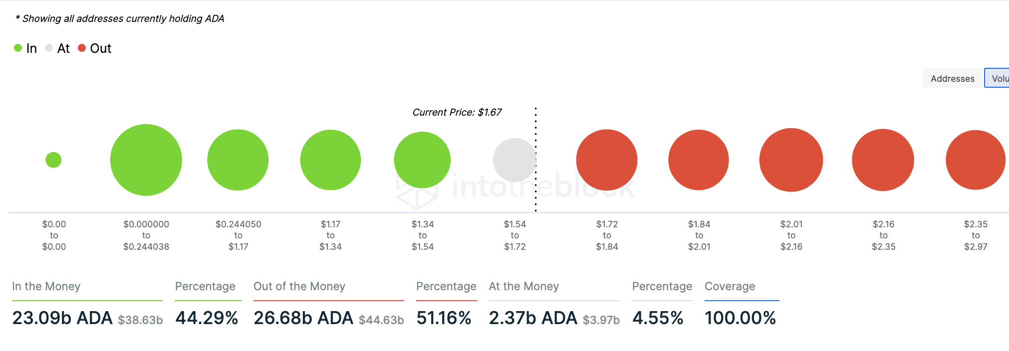 По данным Intotheblock, более 51% держателей Cardano в убытках: они купили токен дороже текущей цены. Кроме того, на графике ниже видно, что почти 400 тыс. адресов купили в совокупности 5,41 млрд токенов ADA по цене $1,7-$1,8. Это значит, что цене будет сложно преодолеть это сопротивление.