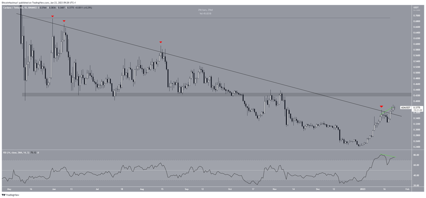 В процессе снижения рынок четыре раза отскакивал от этой линии (красные значки). В последний раз это произошло 14 января. С каждым таким касанием линии становятся слабее, что и помогло курсу ADA совершить ее пробой 20 января и 22 января достичь максимума на $0,387. Следующее сопротивление отмечено на $0,425.