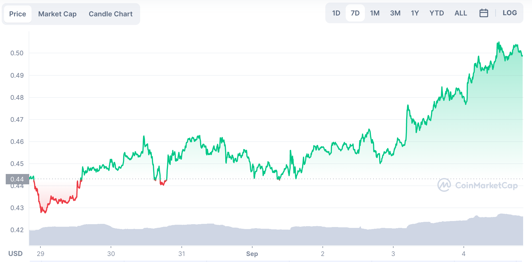 Курс ADA 26 августа упал к $0,43, но 2 сентября восстановился до $0,45. Затем криптовалюта устремилась резко вверх и преодолела отметку $0,50. Рыночная капитализация ADA увеличилась до $17 млрд, позволив токену перебраться на седьмую строчку в рейтинге криптовалют по размеру рыночной капитализации, вытеснив оттуда XRP. На момент публикации ADA/USD торгуется на уровне $0,4984