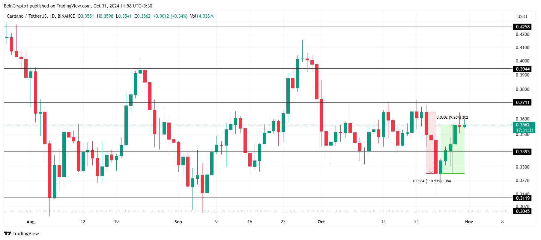 На момент написания этого анализа ADA торгуется по $0,3592, за последние сутки подорожав чуть более чем на 1%. В моменте отмечался подъем практически на 10%, но с тех пор альткоин уже скорректировался.