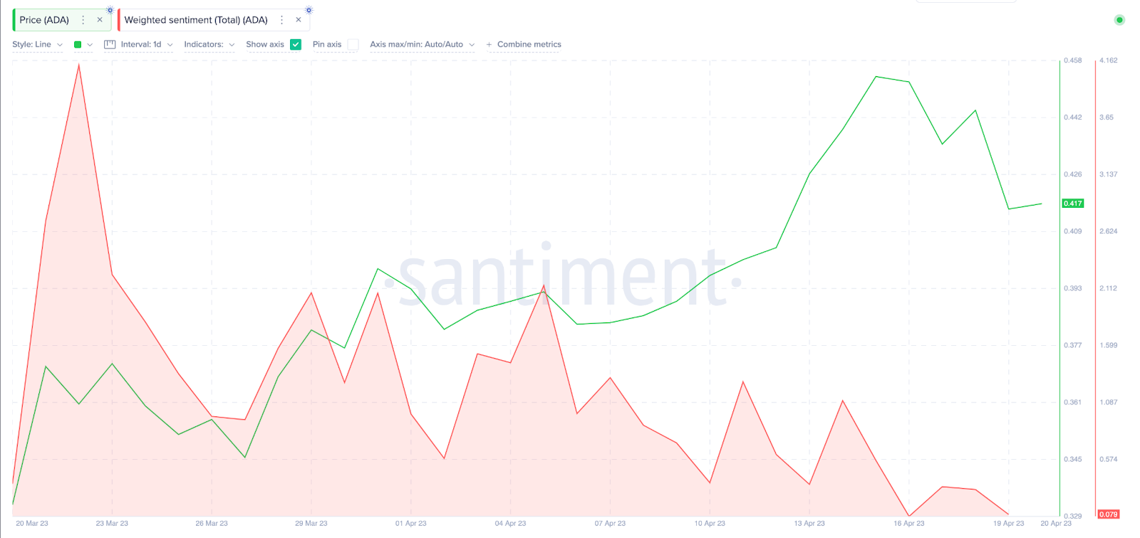 SponsoredКоэффициент взвешенного настроения ADA, тем временем, снизился более чем на 90% — с 4,21 22 марта до 0,08 20 апреля. Это означает, что недавняя динамика актива осталась незамеченной многими криптоэнтузиастами.