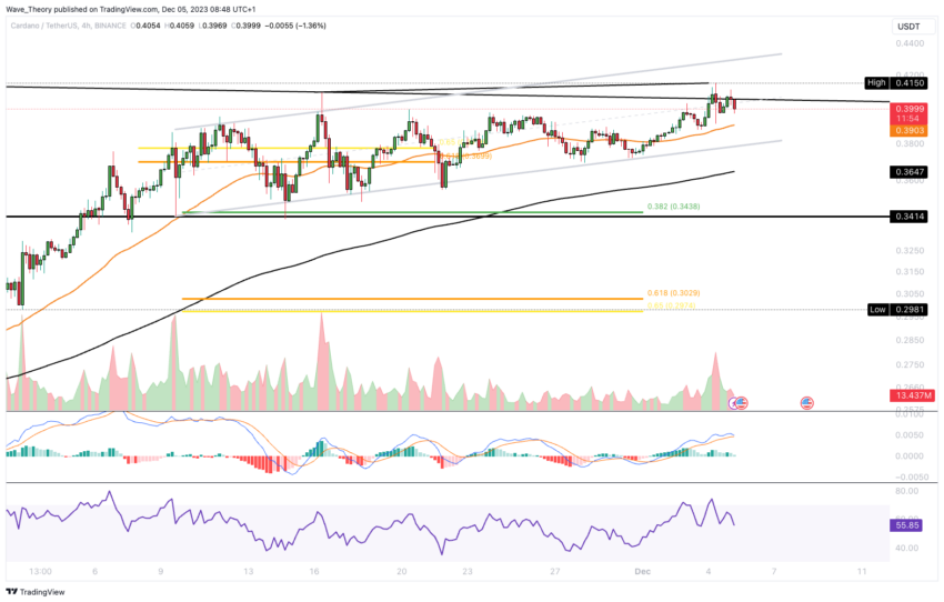 На 4-часовом графике ADA демонстрирует четкий восходящий тренд. Однако гистограмма расхождения схождения скользящих средних (MACD) имеет нисходящее направление, что считается медвежьим сигналом.