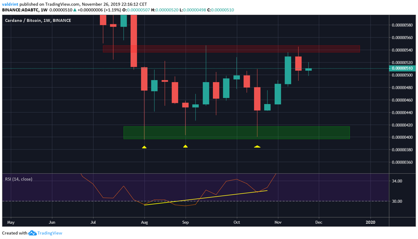 В начале августа курс ADA отметил минимум на 396 сатоши. До октября цена еще трижды возвращалась к этому уровню, сформировав здесь тройное основание. Каждый раз на свечном графике также появлялся длинный нижний фитиль. Это можно расценивать как очень бычьи индикаторы.
