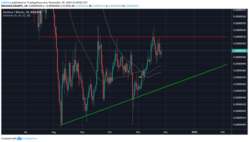 Трейдер @cryptomichNL полагает, что курс ADA нащупал поддержку над отметкой 480 сатоши и теперь может взять курс на сопротивление в области 530-540 сатоши.